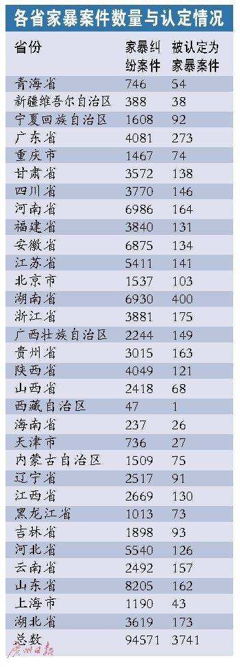 从2014年到2016年,全国涉及家暴的一审案件数量共94571件,仅有38名男性自诉遭遇了妻子的家暴,99.9996%的施暴者都是男性。其中,山东以8205件稳坐榜首,河南以6986件夺得第二,湖南以6930件位居第三。西藏、海南和新疆分别以47件、237件、388件成为家暴案发最低的三个省份。