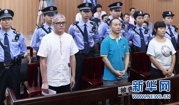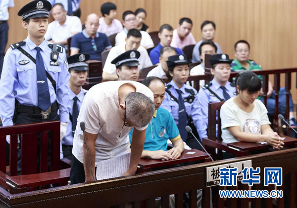 9月26日,曾飞洋(前左)在法庭上鞠躬致歉。当日,广州市番禺区人民法院一审公开开庭审理曾飞洋、汤欢兴、朱小梅聚众扰乱社会秩序案并当庭宣判,认定曾飞洋犯聚众扰乱社会秩序罪,判处有期徒刑三年,缓刑四年;认定汤欢兴犯聚众扰乱社会秩序罪,判处有期徒刑一年六个月,缓刑二年;认定朱小梅犯聚众扰乱社会秩序罪,判处有期徒刑一年六个月,缓刑二年。3名被告人均当庭表示认罪悔罪,服从法庭判决,不上诉。新华社记者 丁海涛 摄